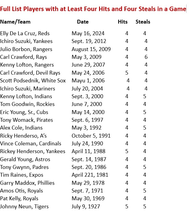 Yesterday (May 16), the Reds’ dynamic (nine homers and 30 steals as of this morning), young (22-year-old) shortstop Elly De La Cruz became just the 29th AL/NL player in the Modern Era (post-1900) to collect at least four hits and steal at least four bases in a game. (Note: Negro Leagues game records from 1920-48 – now considered major-league, have not been fully documented incorporated into the MLB record book). The performance came in a Reds’ 7-2 win over the Dodgers In LA. De La Cruz had three singles, a double and a walk; scored three runs; and drove in one. He stole second base twice and third base twice.