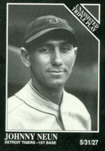 On July 9, 1927 Tigers’ 1B Johnny Neun became just the second – and there are still two still only – MLB player credited with at least five hits and at least five steals one one game. He accomplished the feat on July 9, 1927 in a 14-4 Tigers’ win over the vaunted 1927 Yankees.