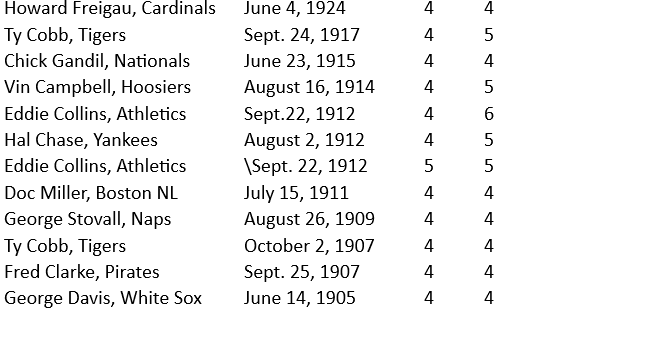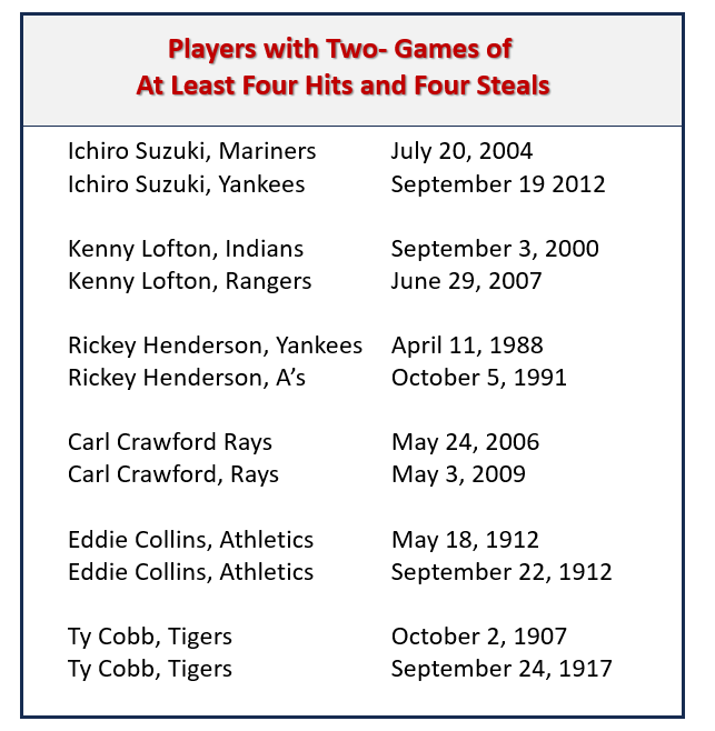 Just six players have had two games of at least four-hit and at least four-steals (see chart below) and only Athletics’ 2B Eddie Collins did it twice in one season (1912).