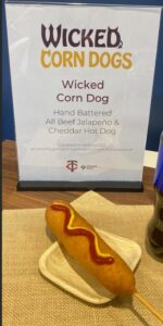 Okay, what’s more baseball than a hot dog? Or what’s more Minnesota (think State Fair) than a corn dog, a hot dog encased in sweet corn meal breading and served on a stick? And could be more wickedly wonderful than enhancing those traditional favorites with spicy jalapenos or cheddar and smooth American cheese and offering it at a Twins game?   Wicked Corn Dogs start with a quality dog from Manea ‘s Meats in Sauk Rapids.  Then each dog is enhanced with jalapeno (a whole jalapeno in each dog) or a well-balanced combination of cheddar and American Cheese. Which one to choose? (Let’s work in some baseball here.) In honor of Twins’ Cy Young Award winner Frank “Sweet Music “ Viola: If you like spicy salsa music, go for the Jalapeno Wicked Corn Dog; If you prefer smooth, cool jazz, it’s the cheese version. Bob, by the way, says he intends make a Wicked Corn Dog his “opening” Opening Day snack.