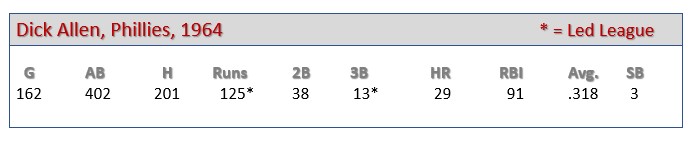Okay, if I had to guess what offensive categories Dick Allen led the league in as a rookie, triples would not likely come to mind. But he did indeed top the NL with nine triples (and 125 runs) as a 22-year-old freshman in 1964. In his rookie campaign, Allen was also first in the NL in total bases, fifth in in batting average, seventh in home runs, fourth in doubles (first in overall extra-base hits). For the sake of transparency, Allen also led the NL in errors and strikeouts.