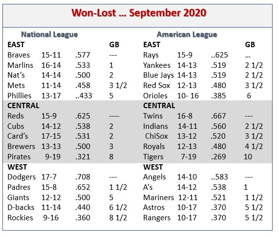 Honorable Mentions: The Reds’ Trevor Bauer also deserves recognition, despite going just 2-2 for the month. Bauer pitched to a 1.29 earned run average and fanned 46 batters (second in MLB), with just six walks in 35 innings. Luis Castillo, also of the Red gets shout out for picking up four wins in five September starts (the only MLB pitcher with four September victories), with a 2.20 earned run average, one complete game and 37 strikeouts in 32 2/3 innings. Like Burnes, Castillo is a surprise in this competition. Going into the month, he was 0-5, with 4.10 earned run average. Finally, there is hard-luck Padre Dinelson Lamet, who started five times, produced a 1.76 ERA and fanned 42 batters in 27 innings, but got only one win and four no-decisions (despite the fact that San Diego won all five of his September starts.