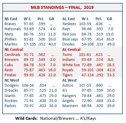 Then there is a deep and “bad” (in a good way) lineup that saw 14 players reach double-digits in home runs and led all of MLB in runs scored. It looks like another winning season (they haven’t had a losing campaign since 1993) for the Bronx Bombers. Judge and Stanton will be power sources (once healthy), 2B D.J. LeMahieu is a professional hitter (.327-26-102), SS Glyber Torres powered 38 home runs and catcher Gary Sanchez hit 34. The Bombers got 20+ long balls from 1B Luke Voit, 3B Gio Urshela and OF Brett Gardner (as well as 27 homers from Judge in 102 games). While the Yankees wait for Judge and Stanton to return, Mike Tauchman and Clint Frazier are capable fill-ins (the pair hit a combined 25 home runs in 156 games).