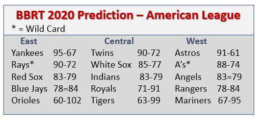 The 2020 MLB season is almost upon us -and it’s time for BBRT’s pre-season predictions. Keep in mind, of course, that these prediction are not based on any inside information. In essence, they represent informed speculation from one fan to another. We’ll start with the American League – first, overall predictions and then team-by-team observations. The National League will be coming soon. Also, for a pre-season look at BBRT’s thoughts on “Why I Love Baseball,” click here.