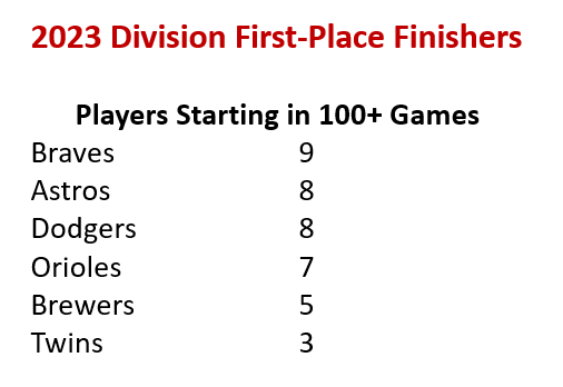 Craig Counsell has consistently brought the Brewers in with wins totals above what analysts (and analytics) project. This year, he brought the Brewers in at 92-70 – capturing the NL Central title. His solid record as a manager is evidenced by the fact that in the five seasons between 2018 and 2022, he finished second in the NL Manager of the Year voting three times. Having spent 16 years on the field as a player, Counsell has gained a reputation as a players’ manager – tough, but fair – who understands the game and how to position players for success. This is likely the year when the writers will give Counsell his due (and recognize his body of work). As an additional note: The chart below provides some evidence of the lineup maneuvering Counsell did as compared to other division winners.