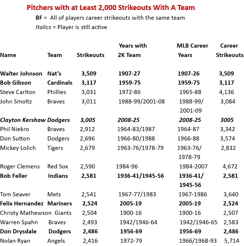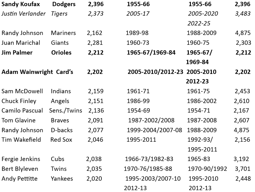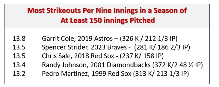 - Most Strikeouts in any Thirty-Game span: Randy Johnson, Diamondbacks – April 13, 2001 – September 17, 2001 AND June 25, 1999 – May 26, 2000 … 328 in 215 1/3 and 239 innings pitched, respectively. The only players besides Johnson to record 300 or more strikeouts in a span of 30 games are: Pedro Martinez (a high of 318), Nolan Ryan (a high of 311), Curt Schilling (a high of 310), Gerrit Cole (301). Note: All of these players except Cole have multiple 30-game spans with 300+ whiffs (many of those spans, of course, were overlapping).