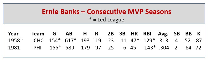 Ernie banks has a unique distinction among players with two consecutive MVP Awards. Not only is he the only shortstop to achieve the feat, he is also the only player to win consecutive MVP Award while playing on losing team for both seasons – and one of only two players to twice win an MVP Award (consecutively or not) while playing on a losing squad.