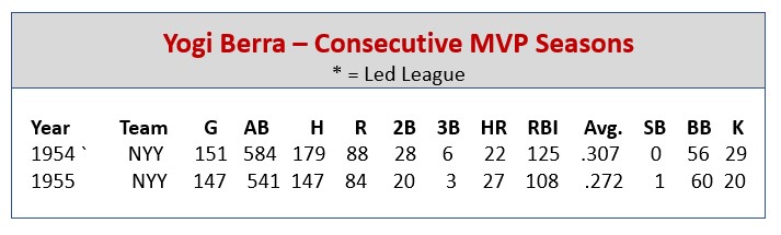 In 1954, Berra won his second MVP Award (and the first of his two consecutive MVP honors), despite the fact that the Yankees finished second to the Indians (the Yankees did post a 103-51 record that season, but the Indians went 111-43). Berra topped the Indian’s Larry Doby by a 230-to-210 point margin. Berra may have been helped a bit by the way the votes split out. Four of the top six finishers were from the Indians (Doby, Bobby Avila, Bob Lemon and Early Wynn). Doby, Avila and Wynn each garnered five first-place votes, while Berra picked up seven. For the season, Berra finished in the American League’s top ten in average (sixth, games played (ninth), doubles (fourth), home runs (seventh) and runs batted in (second). Berra’s 1955 MVP Award saw him outdistance second-place finisher Al Kaline by 16 points (218-201).