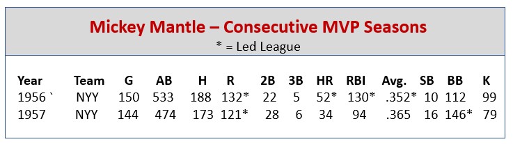 Mickey Mantles’ two consecutive MVP Awards came in 1956 and 1957 and included his .353-52-130 Triple Crown campaign in 1956. Notably, in addition to the 1956 and 1957 MVP honors, Mantle won the MVP award in in 1962 and finished second in 1960, 1961 and 1964 – while playing on Yankee teams that were loaded with potential MVP candidates. Two of Mantle’s three second-place finishes were to teammate Roger Maris, who is also in this lineup of consecutive MVP winners. In his 1956 MVP season, Mantle led both leagues in average (.,353), slugging percentage (,705), runs scored (132), total bases (376), home runs (52) and runs batted in (130).