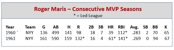 In 1960, as the Yankees won the pennant with a 97-59 record, Maris set new career highs with a .283 average, 39 home runs and a league-leading 112 RBI – and threw in a Gold Glove for good measure. In 1961, as the Yankees went 109-53 (and won the World Series), Maris, of course, made history. He won his second consecutive MVP Award, while also setting a new (since broken) single-season home run record of 61.