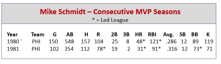 Mike Schmidt enjoyed an 18-season MLB career (1972-89 …. all with the Phillies). He hit .267 (2,234 hits) with 548 home runs, 1,595 RBI, 1,506 runs scored and 174 stolen bases. Schmidt was a 12-time All Star. He led the NL in round trippers eight times (topping 30 home runs in 13 seasons). He also led the NL in runs scored once, RBI four times (with 100+ nine times), walks four times and slugging percentage five times. He earned a total of three league MVP Awards (1980, 1981, 1986).