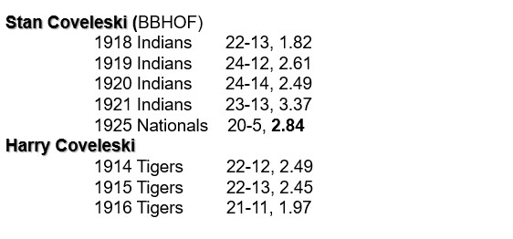 Stan and Harry Coveleski had a combined eight seasons of 20 or more wins – the most of any pair of MLB brothers. (Odds are, if the Cy Young Award had existed during their playing days, they might – like the Perrys – be a pair of brothers with Cy Young Awards.