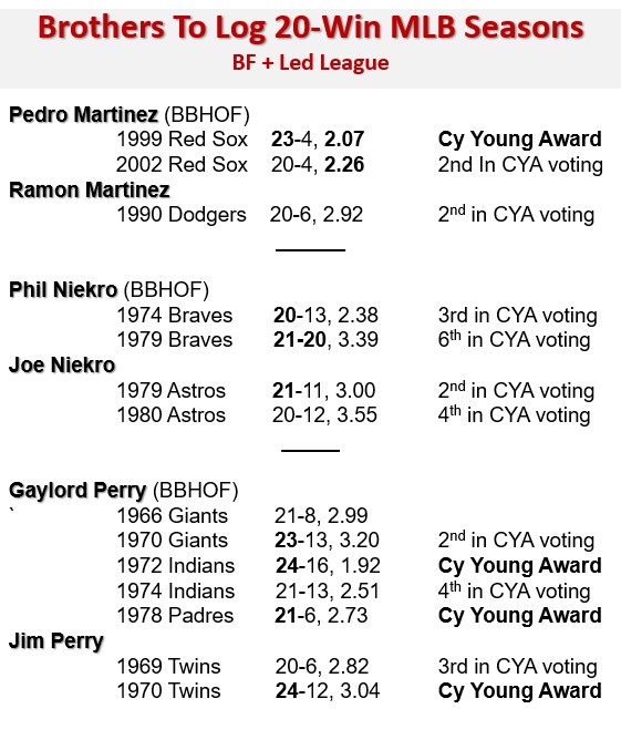 Phil and Joe Niekro and Gaylord and Jim Perry are the only pairs of brothers to record 20 or more wins in the same season as their siblings. The Niekros in 1979, the Perrys in 1970.