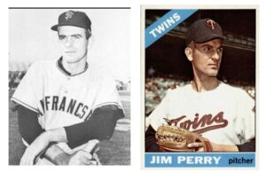 Jim Perry pitched in 17 MLB seasons (1959-75 … Indians, Twins, Tigers, A’s). He won 20 or more games in two seasons. A three-time All Star, he led his league in wins twice and shutouts once. His final regular-season stat line was 215-174, 3.45.